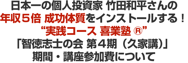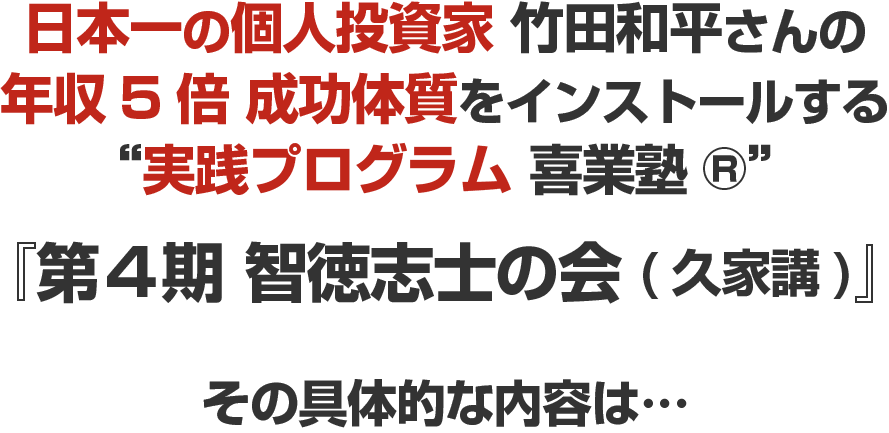 この日本一の個人投資家 竹田和平さんの“本物の思考力”をあなたにインストールして!成功体質に変える“実践プログラム!喜業塾®”は、